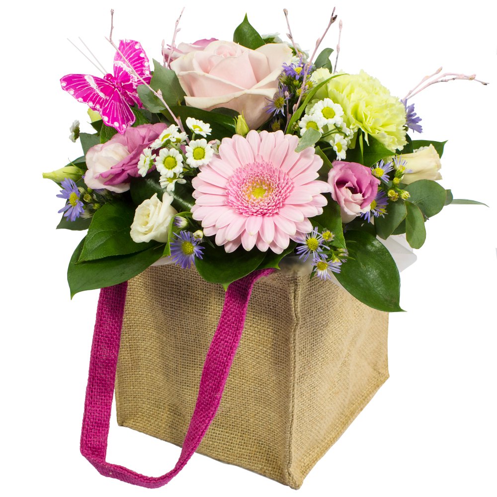 This petite gift bag arrangement in a hessian bag is designed with a lovely mix of pale pink, white and green flowers.